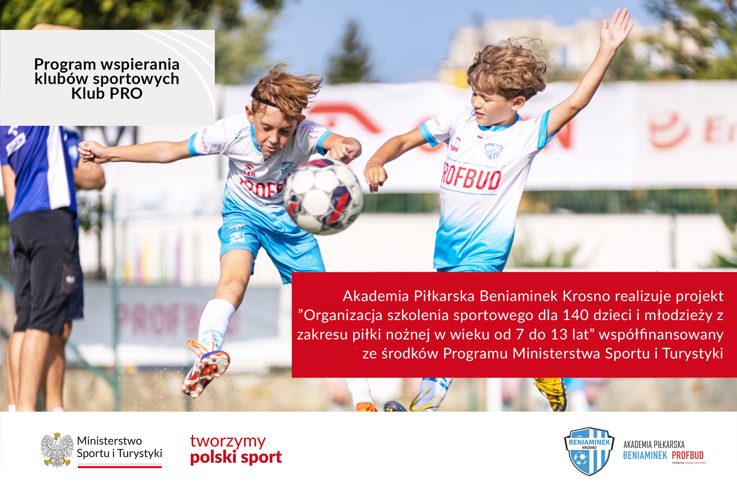 Akademia Piłkarska Beniaminek Krosno realizuje projekt "Organizacja zajęć sportowych dla 140 dzieci i młodzieży z zakresu piłki nożnej w wieku od 7 do 13 lat" współfinansowany ze środków "Programu wspierania klubów sportowych Klub PRO" Ministerstwa Sportu i Turystyki.